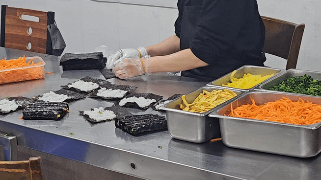 열심히 만드는 김밥고수 이모님들에게 맛의 비법을 여쭤보니